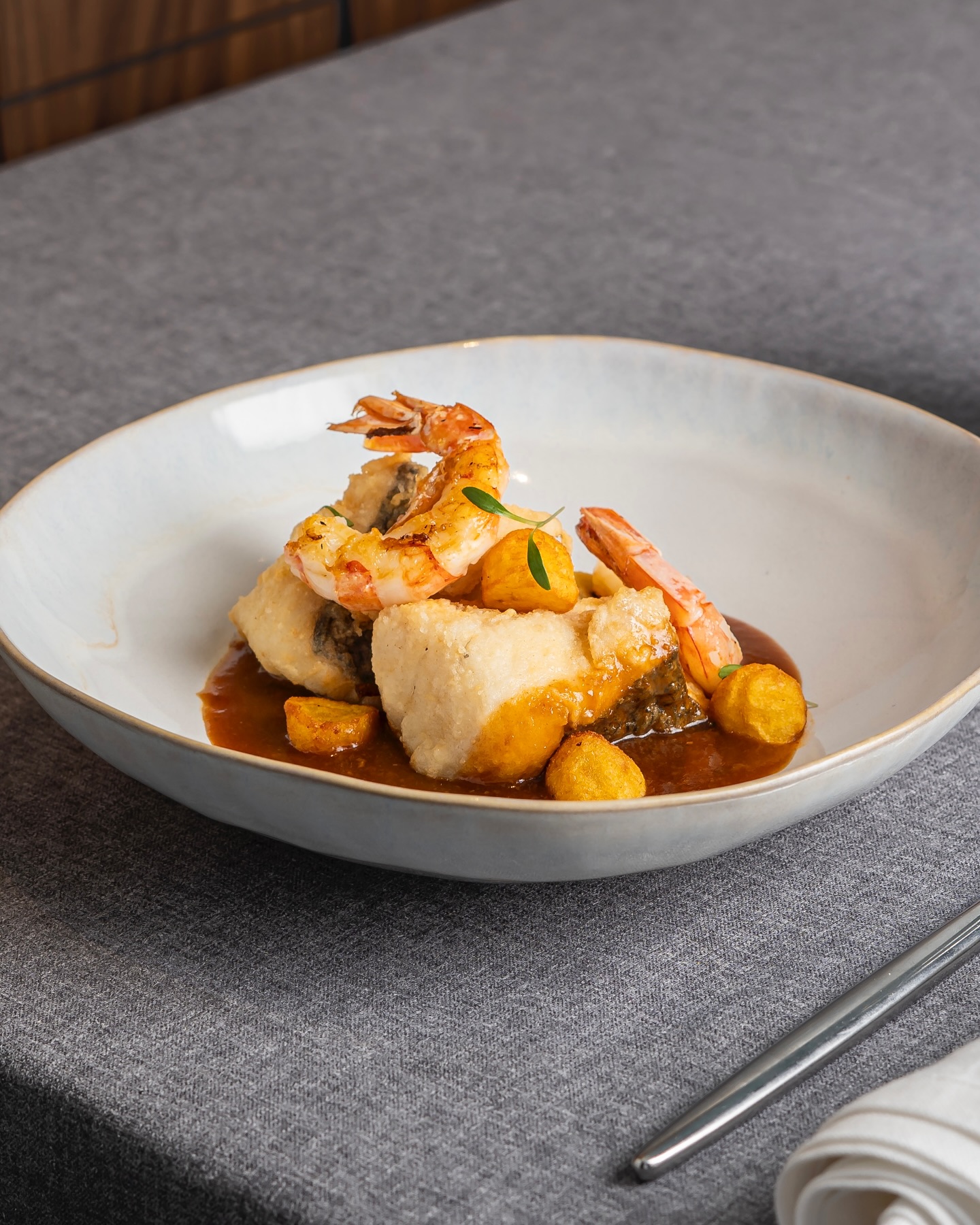 Efficiency and quality at affordable prices shine through a short, tempting menu and a set lunch menu. A great way to begin is by sharing a few starters, such as the confit leek or caramelised onion gyozas, before choosing from oxtail ravioli, fish or meat dishes. Half portions are available. You can tell everything is prepared with TLC. A well-stocked wine cellar and service that runs like clockwork round out the experience. The minimalist space features light wood, generously sized and well-spaced linen-draped tables. An enjoyable dining experience.