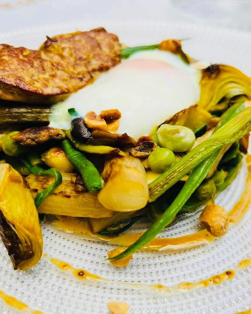 Among Tafalla’s most emblematic spots rises a true classic, with stately dining rooms, a terrace, a 17th-century stone cellar and even a piano bar that adds its own special note. Tradition rules here and vegetables take centre stage: seasonal vegetable stews, Navarre asparagus, artichokes, broad beans and baby peas, not forgetting the borage crêpes with clam sauce and the much-loved traditional patorrillo. A house that has spent decades reminding us that authenticity never goes out of fashion. Classic on the outside, flavourful on the inside.
