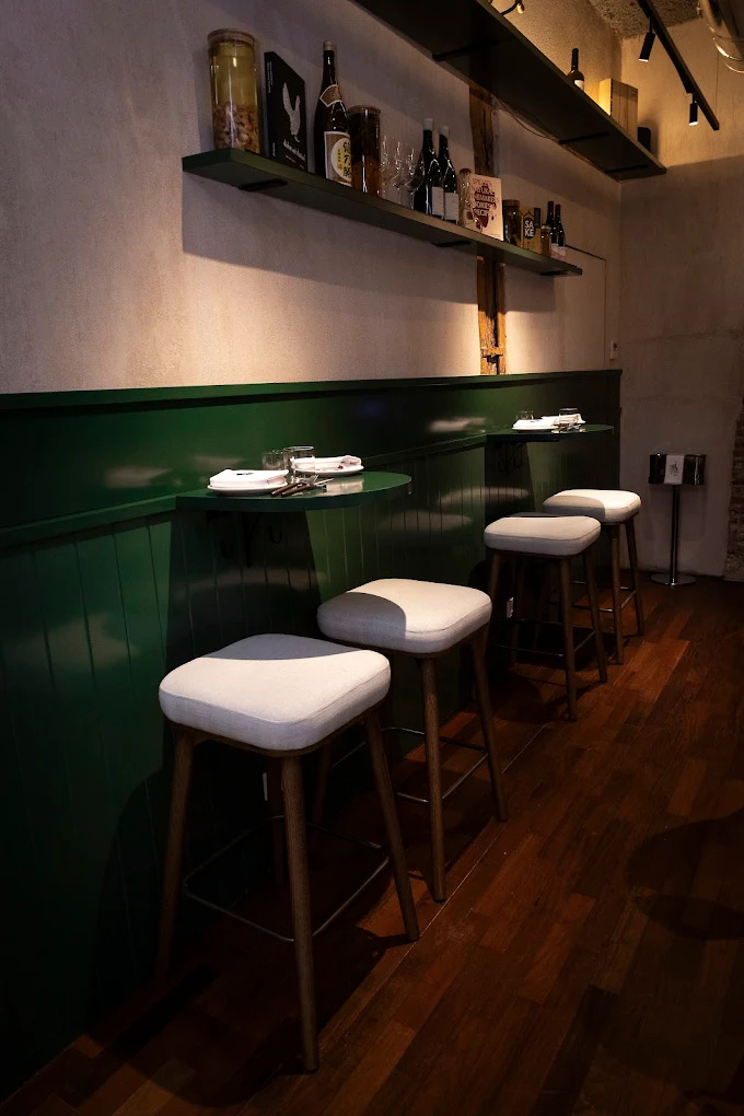 En un espacio pequeño, pero bien cuidado se presenta una cocina de temporada original donde el producto manda. El recetario de siempre se revisita con una mirada personal, con especial atención a la casquería, dando lugar a platos bien resueltos, de estética cuidada y pensados para compartir. La selección de vinos está bien escogida y el servicio acompaña con cercanía. El local es estrecho, con una zona de barra y mesas altas en la entrada y un pequeño comedor al fondo. Una joven promesa a la que habrá que seguirle la pista.