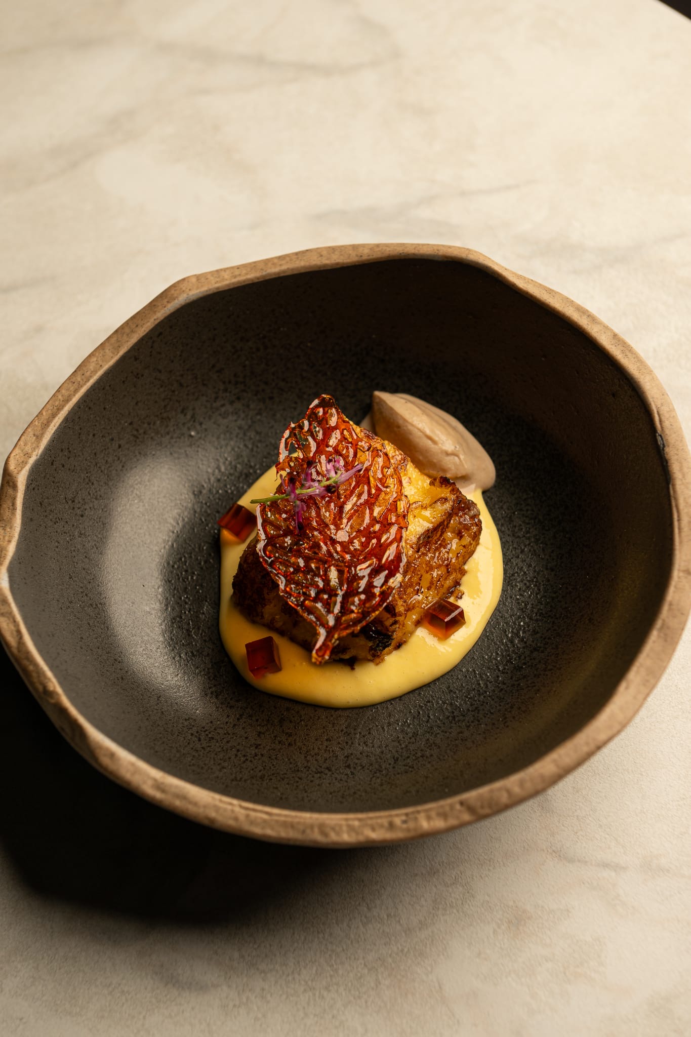 An original proposal of signature cuisine paired with innovative cocktails. There’s no à la carte menu, just three tasting menus. The cuisine fuses dishes from Mexico and Galicia, reflecting the chef's heritage. The focus is on seasonal ingredients, rich broths and intense flavours. The service is friendly and professional. The small dining room is dimly lit, but the tables are well illuminated. There’s also a private room on the upper floor. A dining experience that doesn't disappoint.